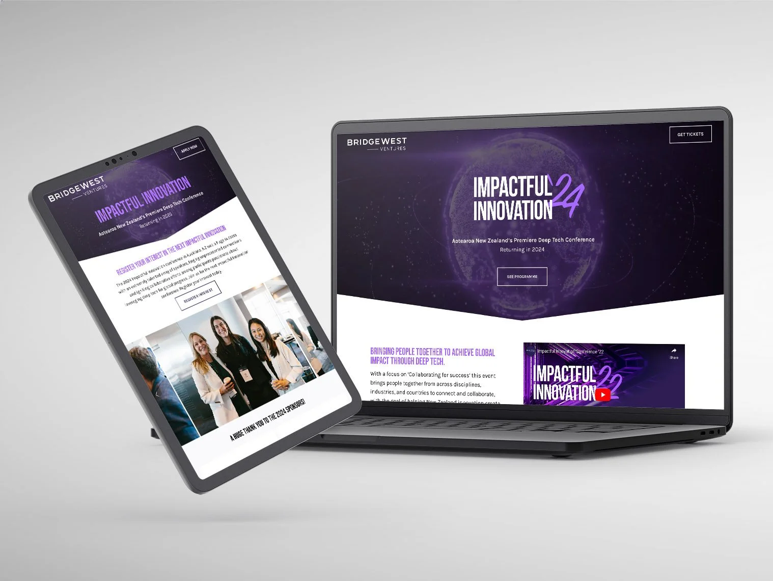 We were really honoured to help Bridgewest Ventures bring the Impactful Innovation ‘24 conference to life. This conference brings deep tech experts, both local and from around the world, to New Zealand to share their knowledge and help inspire the deep tech ecosystem. Our comprehensive creative services included developing a visual theme and brand for the conference, building a website for prospective attendees, and creating an app for on-site participants. We also designed promotional materials, crafted a social campaign to drive awareness and registration, produced event collateral and signage, and provided videography services. Additionally, we produced promotional videos and assets for future conferences.